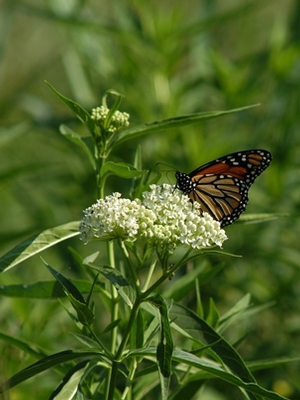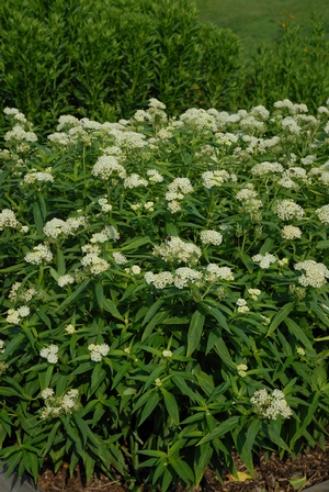 A marvelous long-blooming, bright white selection of swamp milkweed. Clear white flowers and dark green foliage make the colors of the hundreds of visiting butterflies glisten in the sunlight.