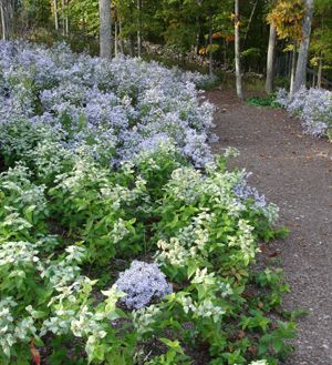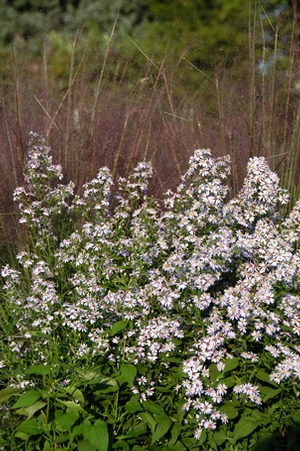 Planted beneath our Acers and Physocarpus, this Aster cordifolius is a great naturalizer at the edge of woods or as a filler among Hostas and Astilbes – covering up their late season deterioration with thick blooms and sweeps of greens. The fibrous root systems are effective erosion control on hillsides.