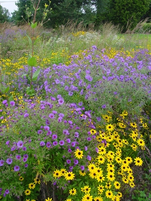 Aster species are an excellent choice for any plant designs considering erosion control or pollinator gardens. In addition to being a nectar resources, it is also forage for Lepidoptera larvae. Aster novi-belgii, now Symphyotrichum novi-belgii, can be found along the edge of our trial bioswales and hillside of the constructed wetlands, handling the moist conditions and controlling erosion.