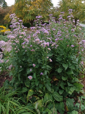 Large leaves (to 2') emerge in the spring and provide a bold backdrop for earlier blooming perennials. In the fall, numerous flower stalks rise to 4 or 5 feet and each is covered with 1" sky blue daisy-like flowers. Flowering is later than many other asters and this species often provides brilliant color until frost. Found by Rick Darke and Skip March at the Jindai Botanical Gardens. This cultivar is shorter than the species and less likely to require staking.