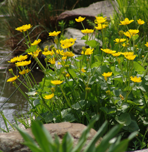 Native to northern states and Canada, this little beauty is at home at pond's edge or along a stream. It is clumping by nature, but can seed in to form a dense groundcover in a consistently moist site. In early spring, hundreds of bright yellow buttercup flowers dot the green carpet of cordate foliage. Deer usually leave this alone! Found in marshes, swamps, and wet meadows from North Carolina to Alaska.