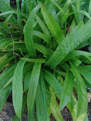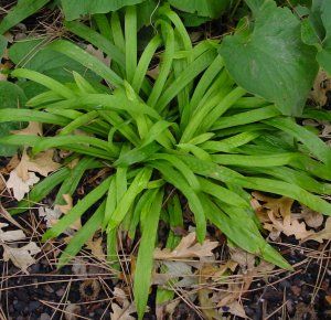 Shiny deep green leaves are unusually broad (to 1 1/8") and puckered like Christmas ribbon. An excellent, mostly evergreen (the basal foliage overwinters) groundcover for average to moist shade, provides unique texture. Flowers occur in early to mid-spring, thin and black-tipped, not especially showy. Found in moist woods from Canada to Alabama.
