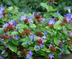 "Belonging to a group of deciduous perennials and shrubs from eastern Africa and Asia, leadwort is a wiry, semi-woody, mat-forming perennial which spreads by rhizomes to form an attractive ground cover. Like many nice groundcovers, it can be somewhat invasive in optimum growing conditions. These plants add a leafy green texture to the garden in summer, electric deep blue flowers from mid-summer on, and couldn't be prettier in autumn with its reddish leaves. Highly rated as a ground cover, it would no doubt be more popular if it didn't die away completely in winter, leaving bare patches in the garden. Plants are late to emerge in the spring, so their location should be carefully marked to avoid damage from early spring cultivation." - gaygardener.com