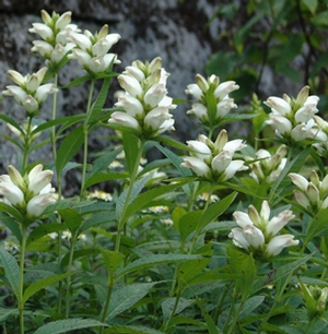 Native to the eastern United States into eastern Canada, turtlehead grows in open woodlands in floodplain areas, sedge meadows, fens, and marshes. It prefers full or partial sun in wet to moist soil conditions with fertile soil containing organic matter. It can tolerate periodic flooding and can do well in a garden if watered during dry spells. In shady areas, plant may stretch. To maintain a good height, Chelone glabra can be pinched or staked in spring or early summer.