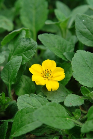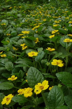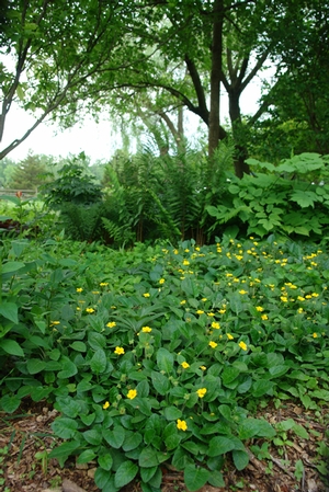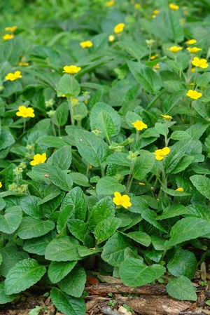 Chyrsogonum virginianum runs through native woodland areas in the eastern United States. Preferring light filtered shade to dense shade, it grows in a wide variety of soil types. The subspecies, var. australe, is different from the straight species by its more prostrate form, shorter flower stems, and the tendency to spread by aboveground stolon, much like a strawberry. Plant is susceptible to mildew in situations with poor drainage and too much mulch limiting air flow around the leaves.