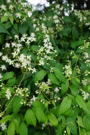 A native replacement to the invasive sweet autumn clematis (Clematis terniflora), you can tell the difference between the two plants by the foliage. Native Virgin's bower has trifoliate leaves with toothed edges and a smoother leaf texture while sweet autumn clematis has trifoliate leaves that are entire (smooth) around the edges and has a coarse texture to the leaf surface.