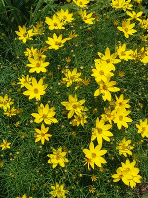 Winner of the 2001 RHS Award of Garden Merit, this threadleaf coreopsis is just a little bit shorter than 'Moonbeam'. 'Zagreb' has bright yellow flowers that sit atop tall, erect, lacey, somwhat mound forming, delicate (threadleaf) looking, green foliage that has an airy appearance. The flowers are abundant and bloom continuously throughout the entire summer. Removal of the dead blossoms encourages longer blooming and healthier flowers. Truly a colorful sight. Great in rock gardens and gardens with poor soil. Makes a good cut flower.