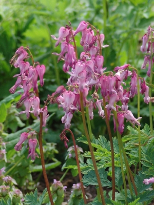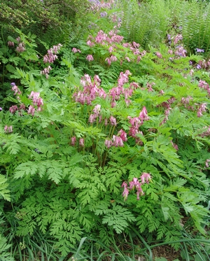 A popular plant for the shade garden, Dicentra eximia is a tremendous performer. The leaves are deeply cut and fern like. The pink flowers are oblong heart shaped with an inner petal that drips from the outer petals, creating the appearance that the heart is bleeding. The flowers are smaller and longer than the old-fashioned bleeding heart, but in long branching inflorescences that encourage a more floriferous species.