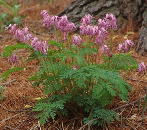 Dicentra eximia is a cornerstone of our American eastern woodland garden in the spring. It can be recognized by its delicate, feathery foliage and pink heart-shaped flowers. The blooms first appear in the spring but in cooler climates, they continue their show sporadically throughout summer. Growing about 15” tall and up to 24” wide, wild bleeding heart fills a midseason color gap when the woodland generally waits for the next wave of blooms. Though not a true ephemeral, Dicentra eximia's foliage often disappears by mid-summer in hotter climates.