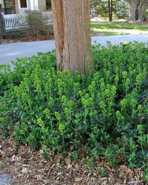 E. amygdaloides var. robbiae differs from others in this species by being rhizomatous, which makes it such a useful groundcover. It will spread quicker if the soil is moist and loose with organic material. Grows in a variety of conditions, including dry shade. Wood spurge is easily propagated by division or cuttings. Useful as a dry shade groundcover or along wooded paths interwoven with more ephemeral plants.