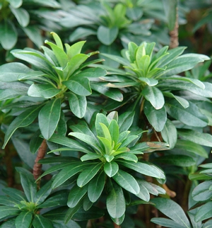 An evergreen plant that is excellent in sun or shade. A carefree, slowly spreading groundcover with shiny, deep green, leathery leaves. Yellow green disc-like bracts back chartreuse yellow flowers in late spring which last for months. Looks fantastic in a pot and in the garden. Grow in a protected site for best winter foliage. Most importantly, this plant has just about zero maintenance requirements. Unbeatable!