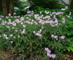 Wild geranium grows best in part to full shade and average to moist, well-drained soils. It is found in Eastern US in dry or moist woods, woodland edges, and dappled meadows. A word to the wise, as the summer goes on, Geranium maculatum can begin to show heat stress and is best planted with late summer or fall bloomers to complement the wild geranium’s late spring and early summer performance. A light shear in the summer can help rejuvenate any foliage damaged by heat stress. G. maculatum can tolerate full sun as long as the soil is consistently moist.
