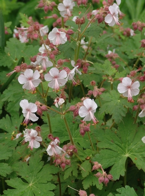 Aromatic carpeting Geranium with light green, semi-evergreen foliage which turns red in fall. Good groundcover. Nodding, reflex-petaled, white flowers that open from pink buds. - Darwin Perennials