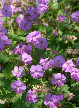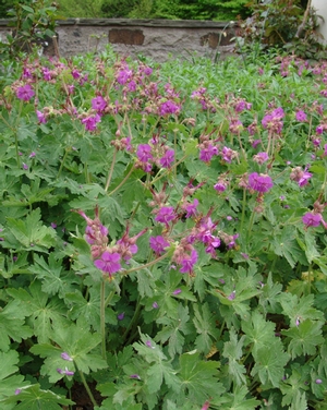A sterile hybrid geranium created in 1974 by Dr. Helen Kiefer at the Cambridge University Botanic Garden in England. It was developed by crossing G. macrorrhizum (female parent) with G. dalmaticum (male parent). This low-growing plant spreads via trailing stems, forming a dense foliage carpet that reaches 8-12 inches tall and spreads 18 inches or more.