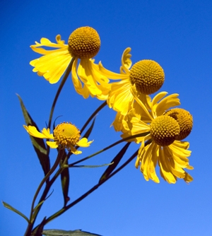 Helenium autumnale is our local native with yellow or bronze single daisy-like flowers on stout branched stems in late summer. The petals have distinct tooth-like indentations giving the common name, dog-toothed daisy. All sneezeweeds have three-lobed petals which distinguish them from Rudbeckia and other yellow coneflowers. In the fall, the flowers develop into brown, rust-colored fruit. Sneezeweed is a treat for cut flower arrangements and a must-have for the avid butterfly gardener.