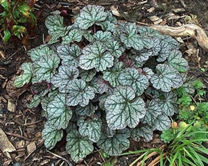 Silver Scrolls is one of the most popular of the hybrid Heuchera by breeder Charles Oliver. This is an extraordinary award-winning variety so popular for its brightly colored foliage in the shady garden setting. The rounded leaves are metallic silver with a scrollwork of dark veining. - Casa Flora