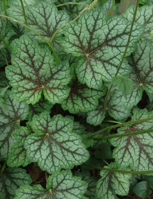 Heuchera americana 'Dale's Strain' is a seed propagated strain selected in North Carolina by Dale Hendricks. Compared to the straight species, it has unique silver-blue marbled foliage and excitingly variable silver venation. In our region Heuchera 'Dale's Strain' is semi-evergreen, however in warmer climates its foliage is more consistently evergreen through the winter. In the spring, pinkish white flowers appear atop long, delicate panicles. Plant grows 12-18” tall and spreads to 18” clump over time.