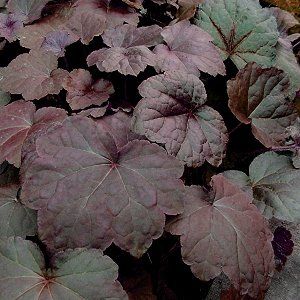 Large, maple-shaped leaves are rich purple-bronze on top, pinkish purple underneath; leaves turn bronze-green in high heat conditions. Creamy white flowers. - Darwin Perennials