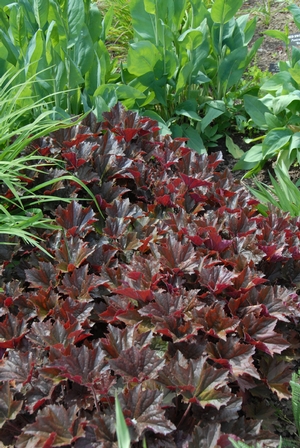 A superb intro from Charles Oliver of the Primrose Path, this is a native late-flowering groundcover. This has much shinier, almost lacquered looking foliage vs. H. villosa 'Purpurea'. Like its cousin 'Autumn Bride', 'Bronze Wave' is sturdy, perhaps an 18", or a bit larger, clump. September-October flowering spikes of small tan flowers. Excellent shade groundcover that can happily compete with tree roots and come out looking good.