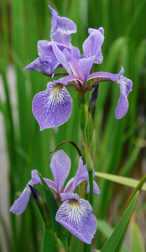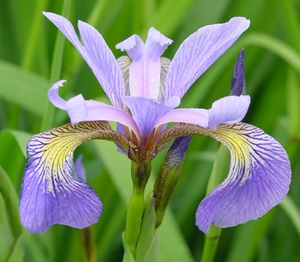 Perfectly at home along a streambank or the edge of a pond, Iris versicolor grows in clumps 1’-3’ tall and 2’ wide. The flowers bloom in early summer from deep violet to white with yellow blotches on the throat. The petals and sepals spread to form an easy feeding vessel for hummingbirds. When the blooms of summer fade, the upright, sword-like foliage provides textural contrast to the garden plants surrounding it. A durable choice, Iris versicolor is perfect for adding a bit of lushness around a water feature or placing in a situation of moist sun where the soil is too wet and heavy for other perennials.