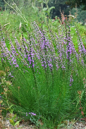 Defying summer extremes of heat, humidity and drought, Liatris microcephala is an easy care herbaceous perennial that thrives in full sun and poor soil. Growing from a woody corm, it produces a tuft of fine textured, grass-like foliage in spring. Then in late summer multiple 2-2½’ erect leafy stems, encircled by numerous ¾” rose-purple flowers, grace its tufted mound. Plants require lean, well drained soil, especially in winter. Small-headed gayfeather makes a vibrant vertical accent in a sunny border combined with Coreopsis delphiniifolia or Rudbeckia fulgida. Its diminutive size makes it ideal in the rock garden nestled with Silene regia, Krigia montana, Bigelowia nuttallii and Ruellia humilis. - Mt. Cuba Center