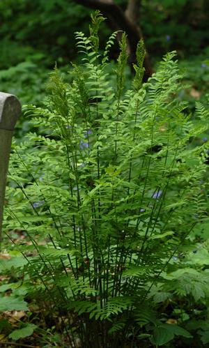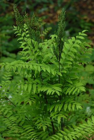 Royal fern is truly one of the most distinctive and spectacular bold-textured deciduous native ferns with its light green, leathery leaves and graceful architectural stature. With adequate moisture, royal fern can reach 6' tall and create a lush, tropical feel along a stream or beside a pond.