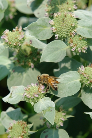 We give up! So many of you claimed this mountain mint to be superior to Pycnanthemum virginianum that we decided to try it for ourselves. We love it! Its leaves are broader and more lustrous, the bracts are silvery and very showy, the flowers are pinkish and its habit is more compact. Nicely aromatic. This native is happiest at the wood's edge, so it is excellent for a naturalized border or woodland garden. Mountain Mint is one of the best nectar sources for native butterflies, so butterfly gardeners can't do without this one. Our bees go crazy for it, too!