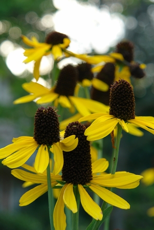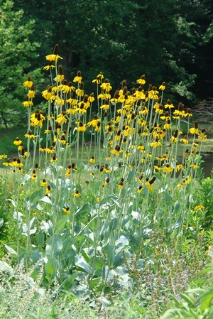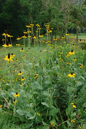 In July, a stand of Rudbeckia maxima backlit by the hot setting sun is in a class of its own. Growing up to 7’ tall and 3’ wide, this native perennial erupts from a mass of 18” glaucous blue-green basal rosettes with a flowering stem that is topped with bright lemon-yellow coneflowers with dark brown centers. Able to withstand hot, humid summers with ease, it is an architectural element in the garden when planted in mass.