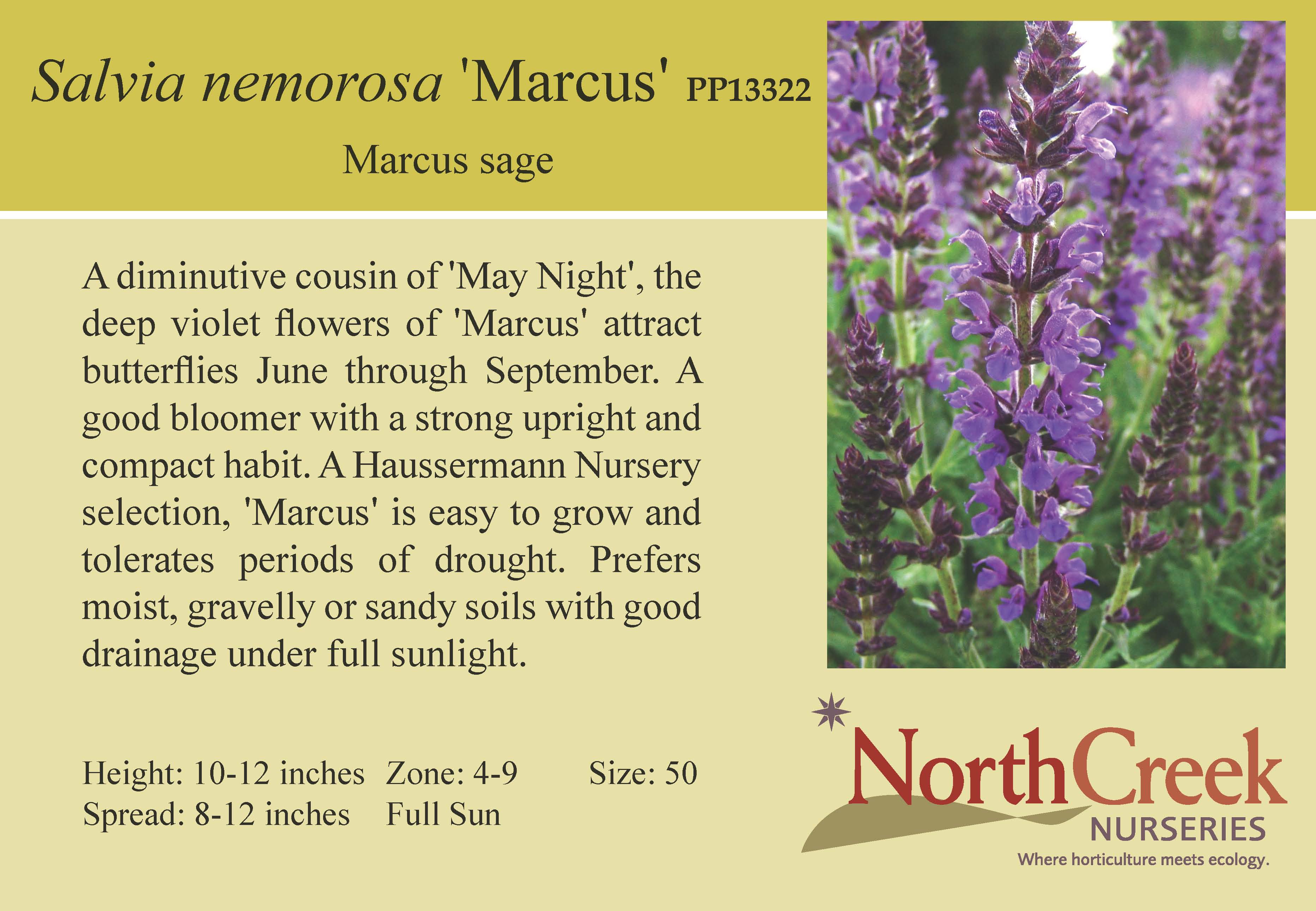 ‘Marcus’ is a dwarf clump-forming perennial salvia with deep violet flowers that typically grows to only 8-10” tall. This cultivar was discovered growing as a naturally occurring mutation of S. nemerosa ‘Osfriesland’ in Germany in 1998. Erect, deep violet flower spikes appear in a lengthy summer bloom. Lance-shaped, green leaves (to 3” long). Flowers are attractive to bees and butterflies. U. S. Plant Patent PP13,322 issued December 3, 2002. It should be noted that ‘Marcus’ was patented under the cultivar name of ‘Haeumanarc’, but The Royal Horticultural Society currently lists it as ‘Marcus’ with no mention of ‘Haeumanarc’. - Missouri Botanical Garden
