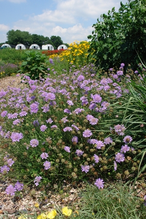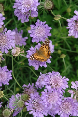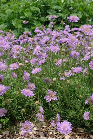 A profusion of blue-purple pincushion flowers. A fantastic performer and butterfly magnet, flowering continuously from May to killing frost. Top ten container and sunny border plant and cut flower.