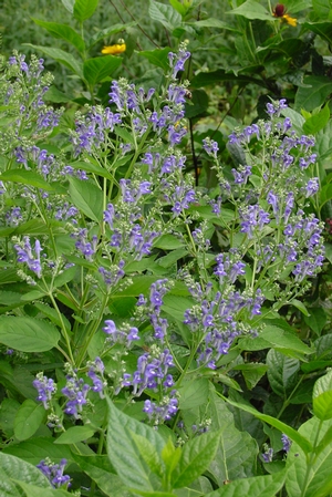 Scutellaria incana is found at woods edges, thickets, rocky slopes above rivers and in sunny meadows from New York to Arkansas. It can take a wide range of soil conditions, from sandy to rocky, but is especially notable in its way of managing heavy clay. It spreads by strong rhizome and will form a dense clump when placed in moist, rich soil. Hoary skullcap prefers full sun but can tolerate light shade. As with most plants, less light results in a more sporadic and shorter bloom display.