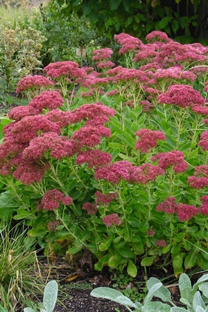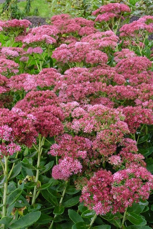 An improvement on a classic upright sedum with large flat flower heads, this selection holds up much longer into fall than 'Autumn Joy'. Plants are easy in almost all soils and grow in full sun to part shade. Deciduous, glaucous, waxy blue-green stems and leaves with alternate leaves on succulent stems. Plants go from light rose to bright red to deep bronze red in color as fall turns into winter. 18-24 inch tall and 20-30 inches wide. Very showy in late fall – leave the stems on over winter and they look great in the snow, keeping a rusty red color. Butterflies and bumblebees love this plant. Plants are useful in the border, rock garden, or as a filler in that odd spot. Mix in with 'Stella De Ora' daylilies and garden phlox. Plants are long lived and can grow into very large clumps. - Hardyplants.com