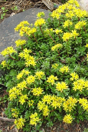 If only all plants were as easy to grow as Sedums, then gardeners would clothe the suburbs in unbroken chains of color and life. They pack considerable water reserves in their succulent, spongy leaves, which not only helps them in times of drought, but also makes them exceptionally easy to root from cuttings broken off the plants in summer and stuck anywhere you want a new plant to grow. Some of the small creeping species can even be crumbled up and cast about like seeds. They will sprout up quickly as a thick groundcover -- what a heady feeling that can be for the underconfident gardener. There are several thick-crowned, clumping Sedums in our flora, and a number of the low, creeping types that fill in spaces between larger plants or crevices in rocks or cliffs. They all produce broccoli-shaped or flat-spreading flower heads with upward-facing, starry-crystalline blooms that must be tireless nectar producers, for the flowers are covered with satisfied insects. They seem especially attractive to hoverflies, whose larvae are important aphid predators in the garden. Many of the creeping types are evergreen or semievergreen, with leaves of many shapes, sizes and colors. They make adaptable low groundcovers for the rock garden, ledge, or between paving stones. - William Cullina, The New England Wild Flower Society Guide to Growing and Propagating Wildflowers, p. 188