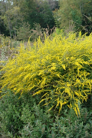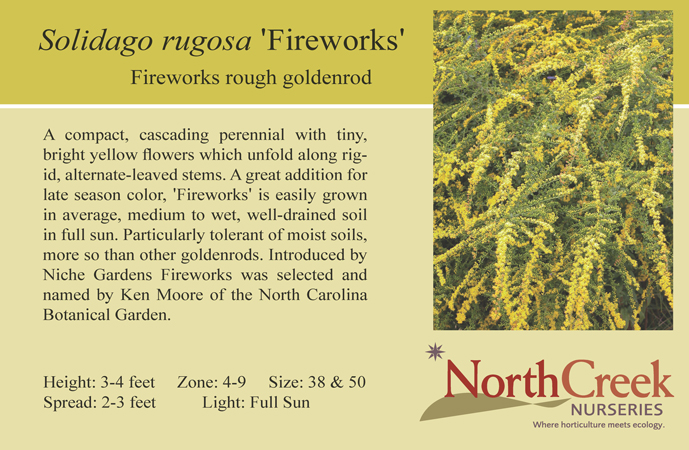 Solidago rugosa ‘Fireworks’ is a compact, cascading, clump-forming native cultivar with a radiating flower form that really looks like fireworks! In 1993, ‘Fireworks’ was selected and named by Ken Moore of North Carolina Botanical Garden in and introduced by Niche Gardens. Growing 3-4’ tall and spreading 2-3’ wide, ‘Fireworks’ is a tough and robust selection of Solidago rugosa and was top-rated in the Chicago Botanic Garden Solidago Evaluation. Flowers begin their dazzling display by late August and are a welcome addition for late season color and to lure the butterflies in your garden.