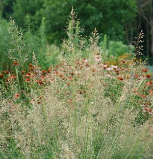 According to wild Niel Dibol, of Prairie Nursery, Westfield, WI, it is "often considered to be the most handsome of the prairie grasses. It makes a well defined and very distinctive border." Fine textured, deep green foliage with lovely, light and airy flowers to 2 1/2" in September and October. Flowers have a slight fragrance similar to coriander. Often has glowing pumpkin orange fall color. Good drought tolerance.