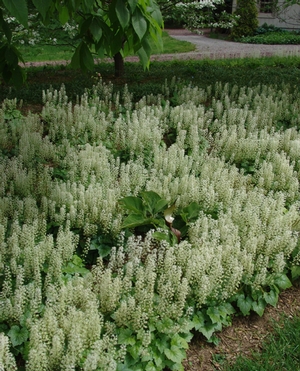 From our friend Sinclair Adam (The Pharoah of Foamflowers) of Dunvegan Nursery, Tiarella cordifolia 'Brandywine' is rated as one of the most vigorous of the genus. A strong grower with glossy, rugose leaves and excellent bronze fall and winter color. Bold, creamy white flowers persist for 6 to 8 weeks. A robust clump former with some short runners in spring and fall.
